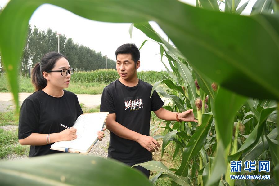 在山東省德州市平原縣的農(nóng)場玉米地里,楊春雷(右)和卜璐璐查看玉米的長勢并監(jiān)測病蟲害狀況(8月22日攝)。 新華社記者 王凱 攝