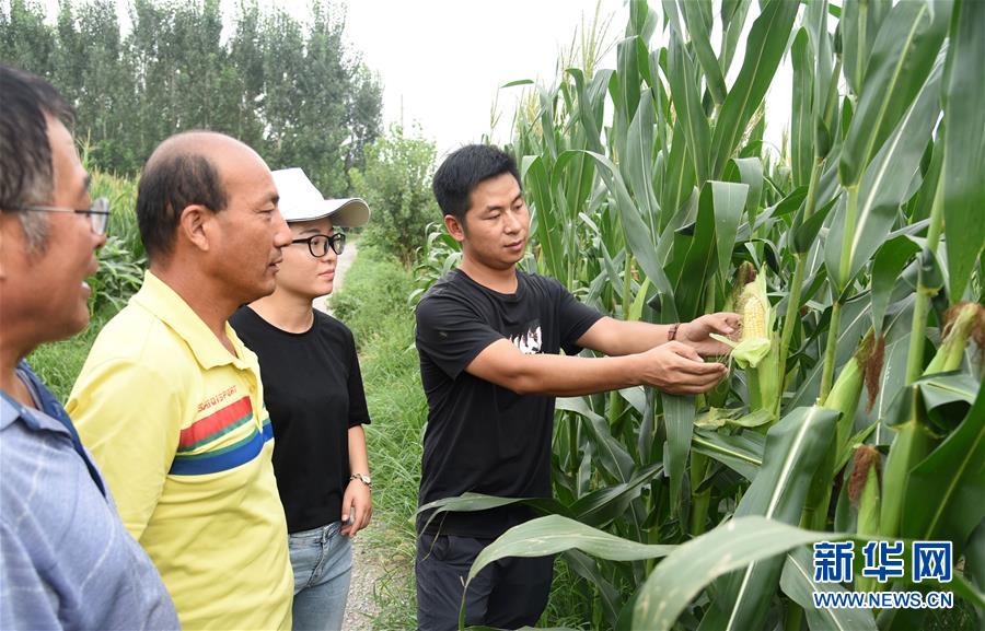 在山東省德州市平原縣的農(nóng)場玉米地里,楊春雷(右一)、卜璐璐(右二)指導(dǎo)當?shù)剞r(nóng)戶學(xué)習(xí)有關(guān)科學(xué)種植的知識(8月22日攝)。 新華社記者 王凱 攝