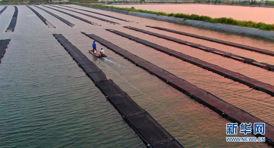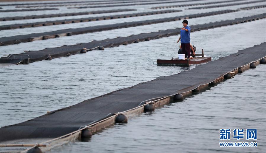 郭旗在魚棚擦去濺在臉上的水滴(9月5日攝)。 新華社記者 楊青 攝