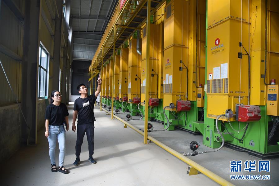 在山東省德州市平原縣的農(nóng)場里,楊春雷(右)和卜璐璐在烘干車間查看引進的高科技設(shè)備——低溫循環(huán)式谷物干燥機(8月22日攝)。 新華社記者 王凱 攝