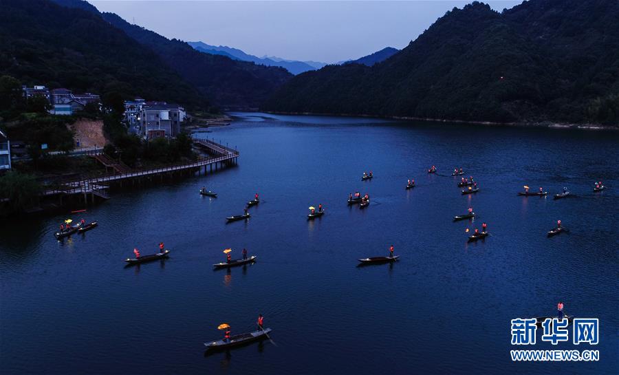 9月25日,在宋村鄉(xiāng)云源港的水面上,漁民劃著漁船,船頭點亮漁燈,構(gòu)成一幅“漁舟唱晚、萬家燈火”的美麗圖景(無人機(jī)拍攝)。 近年來,浙江省杭州市淳安縣宋村鄉(xiāng)積極發(fā)展鄉(xiāng)村旅游,打造漁家元素特色景觀,助力鄉(xiāng)村振興建設(shè)。目前,宋村鄉(xiāng)依托山水景觀和漁家文化,帶動了當(dāng)?shù)鼐访袼藓图碁╂宜⒆灾鸁?、農(nóng)事體驗、民俗攝影采風(fēng)為一體的特色旅游發(fā)展。2019年1月初至7月底,全鄉(xiāng)接待游客10萬人次,實現(xiàn)旅游經(jīng)濟(jì)收入1300萬元。 新華社記者 徐昱 攝