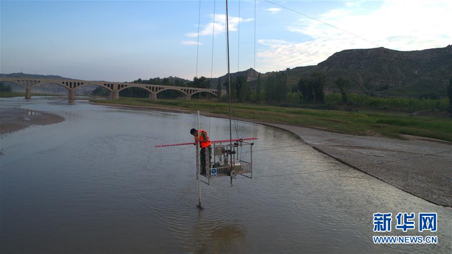 溫家川水文站站長(zhǎng)鄭威在窟野河取沙(9月7日攝)。新華社記者劉詩(shī)平攝