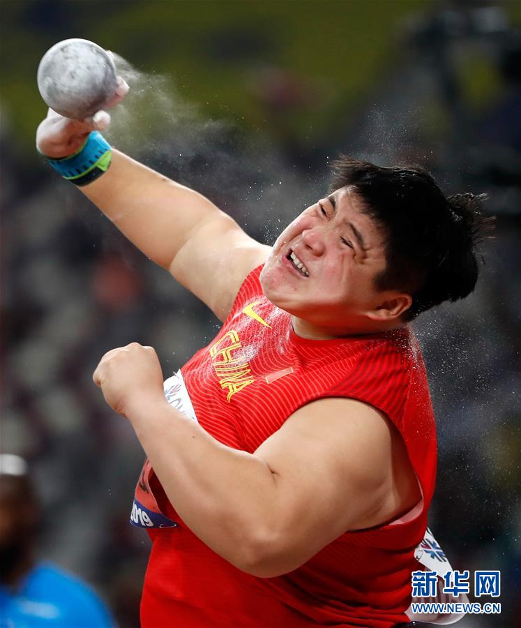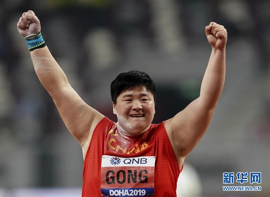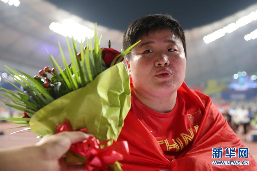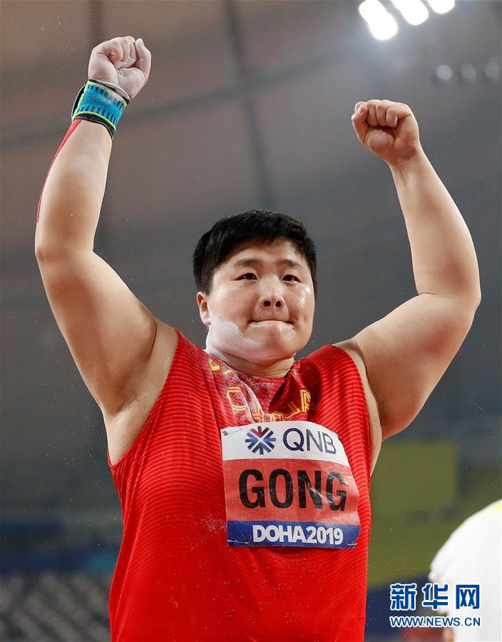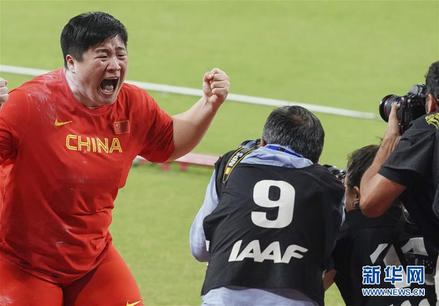 當日,在卡塔爾多哈舉行的2019國際田聯世界田徑錦標賽女子鉛球決賽中,衛(wèi)冕冠軍、中國選手鞏立姣以19米55的成績奪得冠軍。 新華社記者賈宇辰攝
