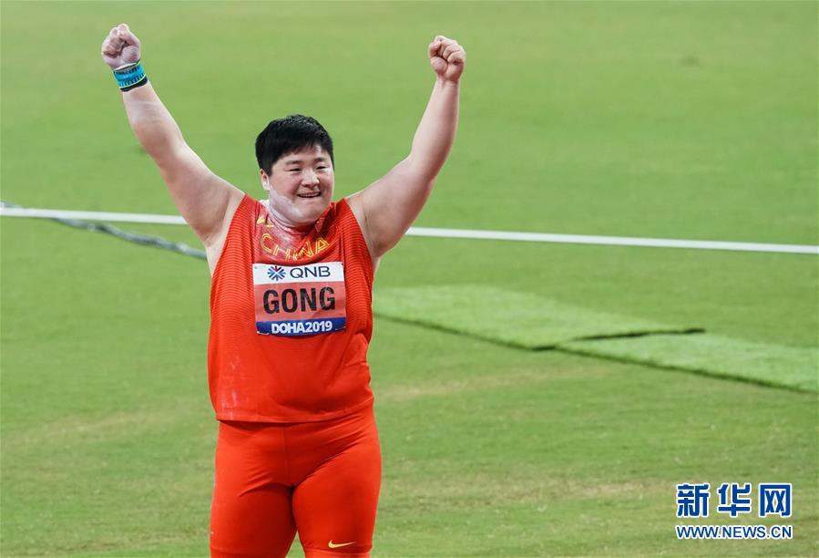 當(dāng)日,在卡塔爾多哈舉行的2019國際田聯(lián)世界田徑錦標(biāo)賽女子鉛球決賽中,衛(wèi)冕冠軍、中國選手鞏立姣以19米55的成績奪得冠軍。 新華社記者王婧嬙攝