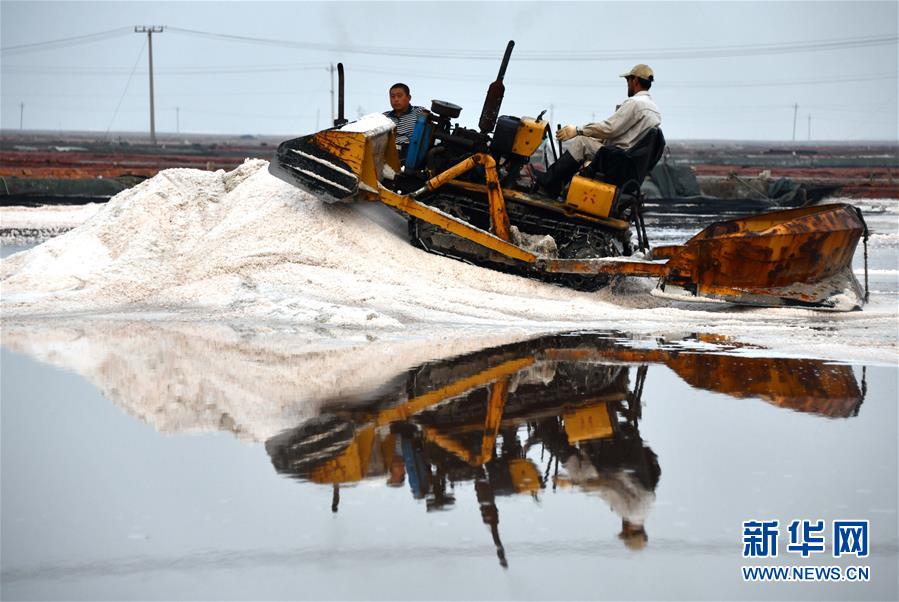 魯北鹽場(chǎng)工人在鹽池中收獲海鹽(10月9日攝)。新華社記者 朱崢 攝