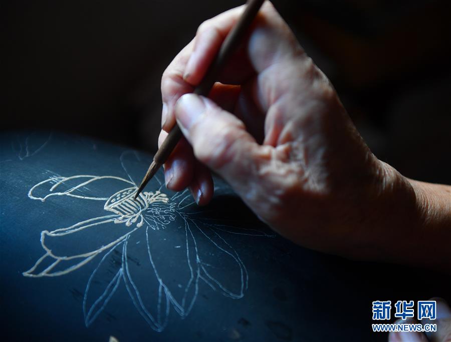 10月12日,丁國(guó)坤在家中將金屬花紋圖案鑲嵌在一件脫胎漆器上。新華社記者胡晨歡攝
