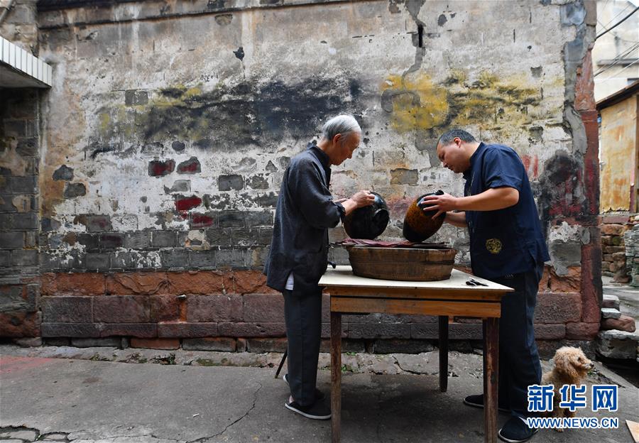 10月12日,丁國(guó)坤(左)和徒弟在家門口對(duì)未成形的脫胎漆器進(jìn)行“磨顯”工序。新華社記者胡晨歡攝