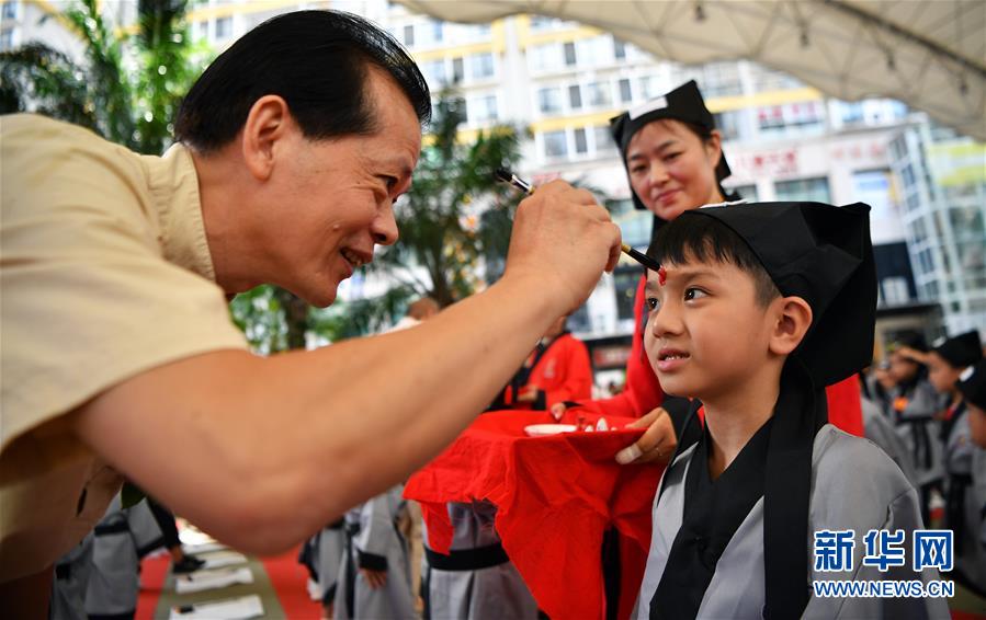 10月13日,參加儀式的嘉賓為小朋友“點朱砂”。當日,??诤嬌賰核囆g(shù)中心為500名小朋友舉行“開筆禮”,通過“點朱砂,啟智慧”“習書法,描人字”等儀式讓孩子們體驗中國傳統(tǒng)文化。新華社記者郭程攝