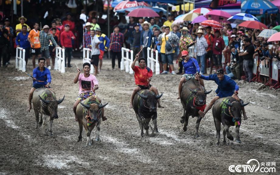 央視網(wǎng)消息:當(dāng)?shù)貢r(shí)間2019年10月12日,泰國春武里舉行一年一度的水牛賽跑,選手騎牛狂奔。視覺中國
