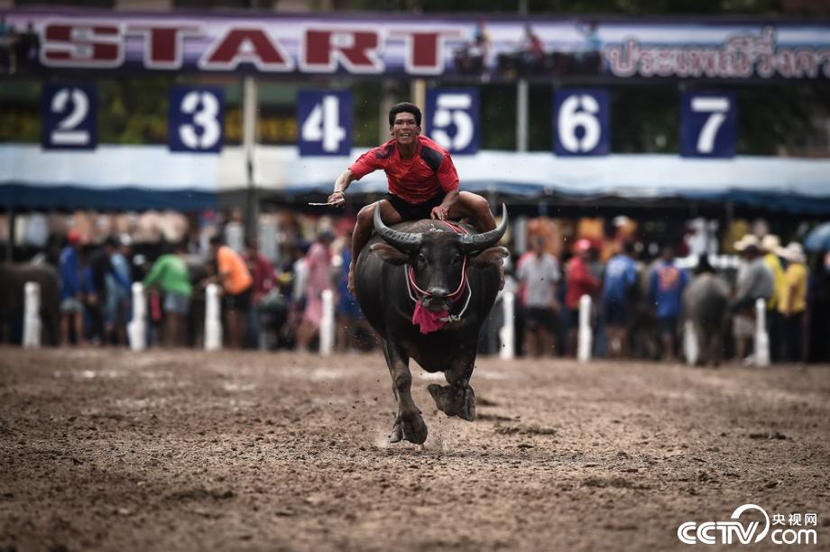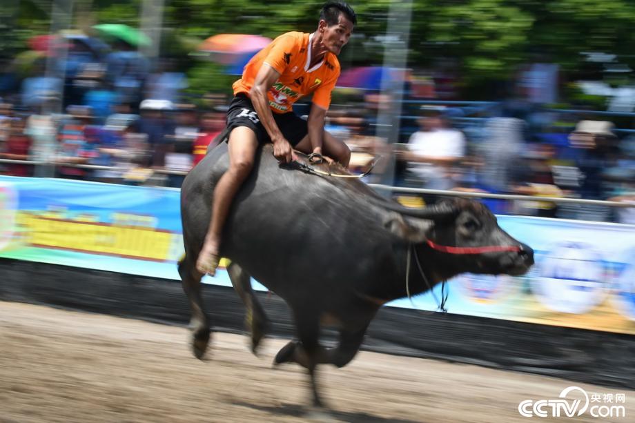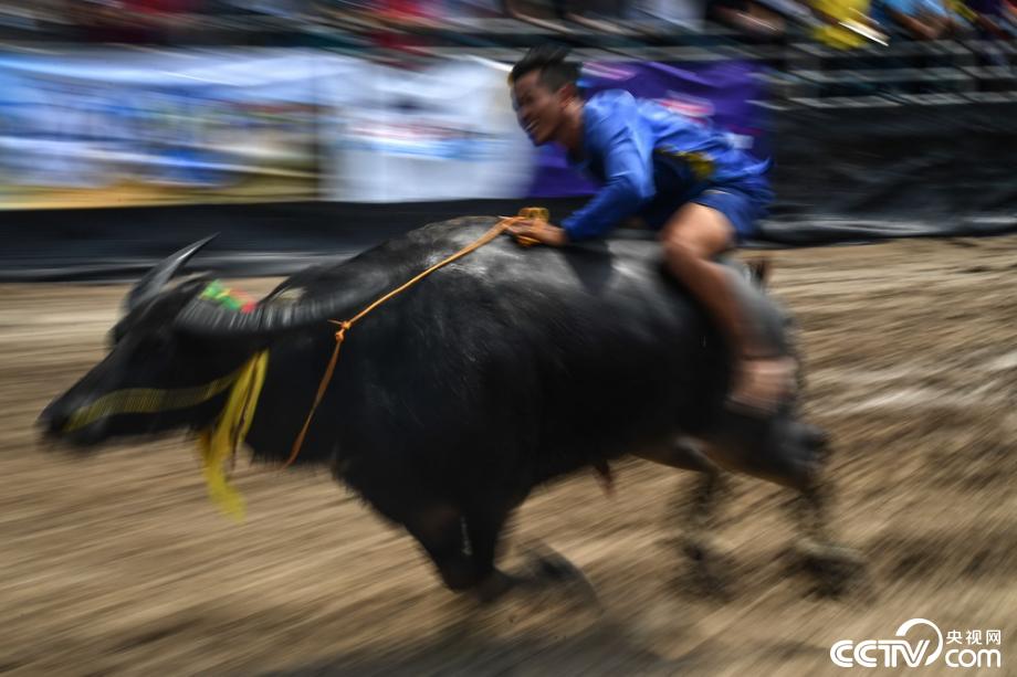 央視網(wǎng)消息:當(dāng)?shù)貢r(shí)間2019年10月12日,泰國(guó)春武里舉行一年一度的水牛賽跑,選手騎??癖?。視覺中國(guó)