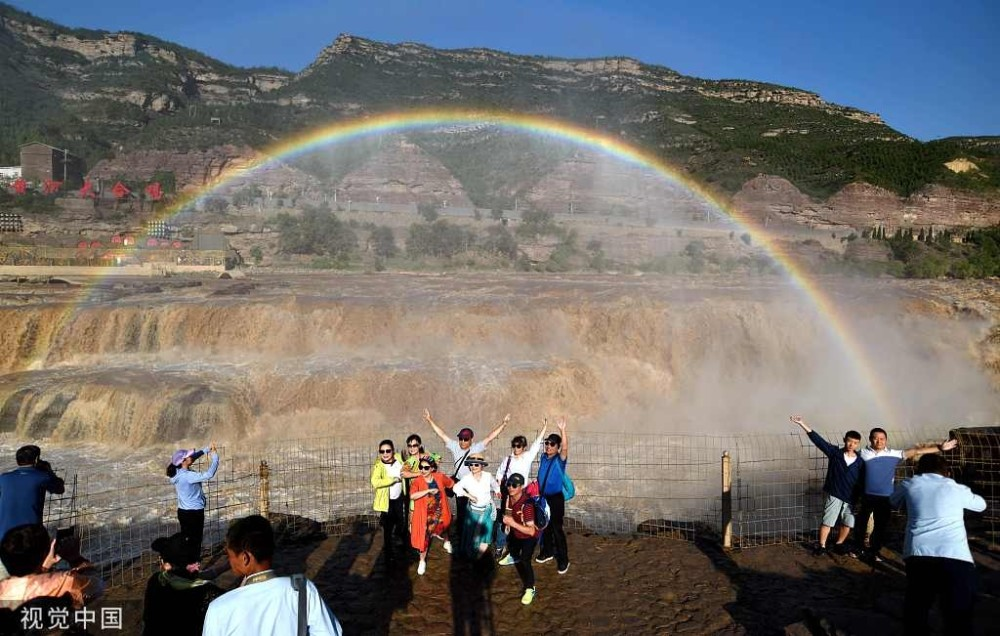 入秋以來,山西吉縣黃河壺口瀑布景區(qū)天氣晴好,黃河干流水量豐沛,壺口瀑布飛濺的浪花和水霧在陽光的照射下,形成“彩虹門”景觀,吸引了眾多游客。