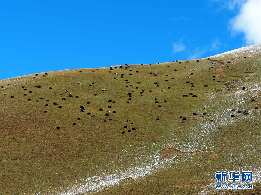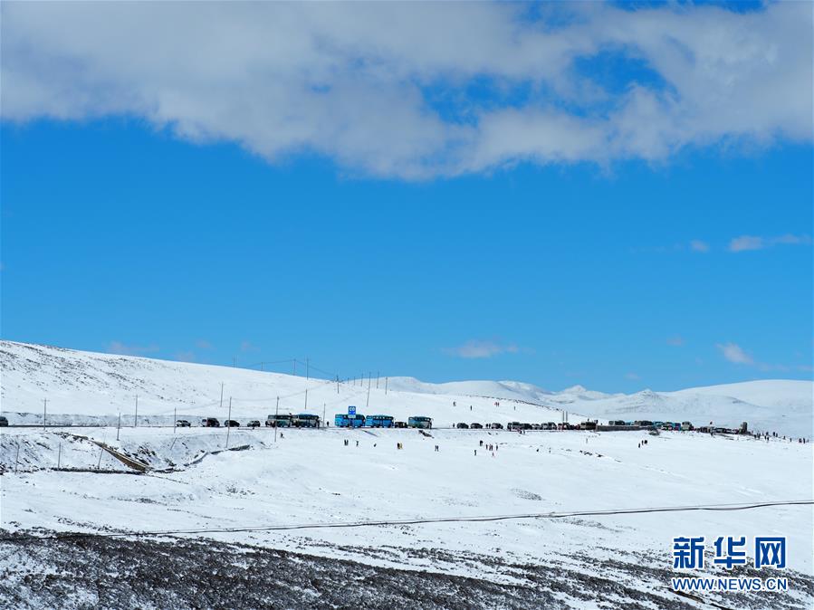 10月17日,在川藏線高爾寺山至理塘路段,部分游客在一個路邊觀景臺附近拍照留念。當日,一場夜雪后,川藏線高爾寺山至理塘路段披上了一層銀裝。雪山、牦牛、云朵、松林,帶來了濃濃的雪域風情。  新華社記者 王迪 攝