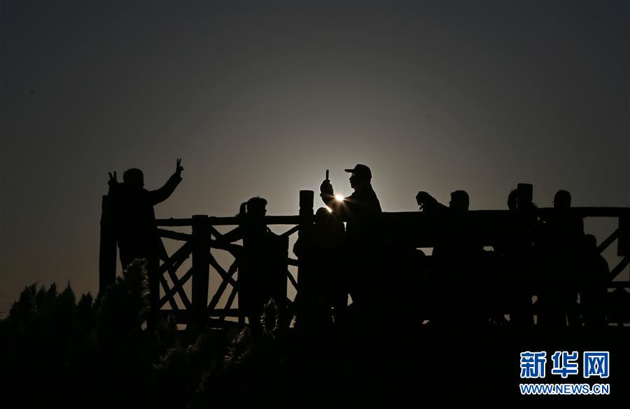 10月17日,游客在居延海岸邊的木棧道上觀賞水鳥(niǎo)。新華社記者 彭源 攝