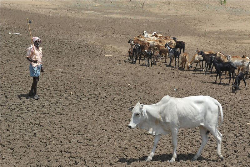 當(dāng)?shù)貢r間2017年5月30日,印度特倫甘納,印度農(nóng)民在干涸的河床上放羊和牛。NOAH SEELAM/視覺中國編輯/陳進(jìn)