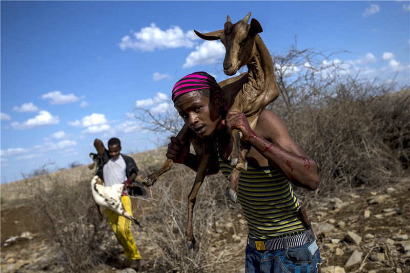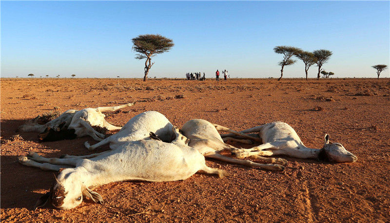 當(dāng)?shù)貢r間2016年12月15日,索馬里邦特蘭,干旱的土地上散布著羊的尸體。當(dāng)?shù)卦庥龈珊堤鞖?,牲畜受到危害?/p>