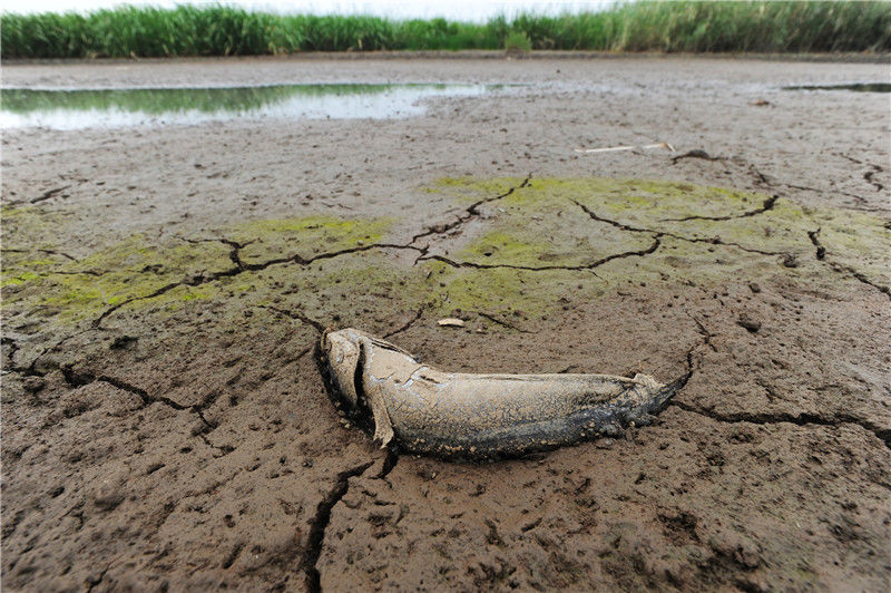 2011年9月21日,江西鄱陽湖,一條沒來及逃離的魚干死在河床上。