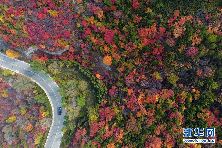 車(chē)輛行駛在山西省太原市玉泉山盤(pán)山公路上(10月22日無(wú)人機(jī)拍攝)。