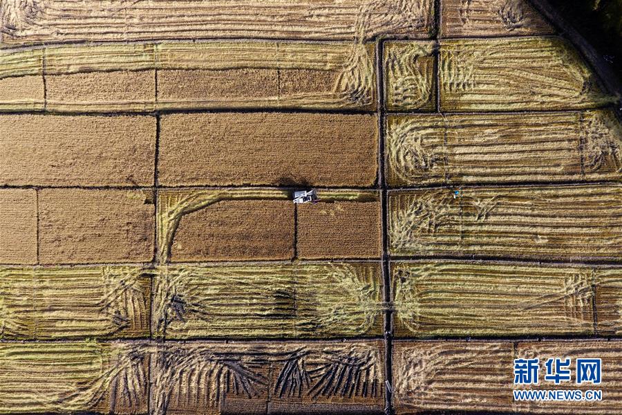 在太原市晉源區(qū)赤橋村,收割機(jī)在稻田里作業(yè)(10月28日無人機(jī)拍攝)。