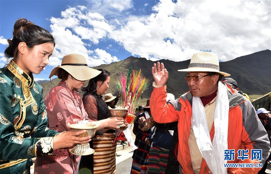 向來自遠(yuǎn)方的新鄰居敬獻青稞酒(2018年6月18日攝)。經(jīng)過兩天的馳騁,11輛大巴和31輛大貨車緩緩駛?cè)肜_市堆龍德慶區(qū)古榮鄉(xiāng)嘎沖村,標(biāo)志著西藏首個高海拔生態(tài)搬遷項目正式實施。新華社記者覺果攝