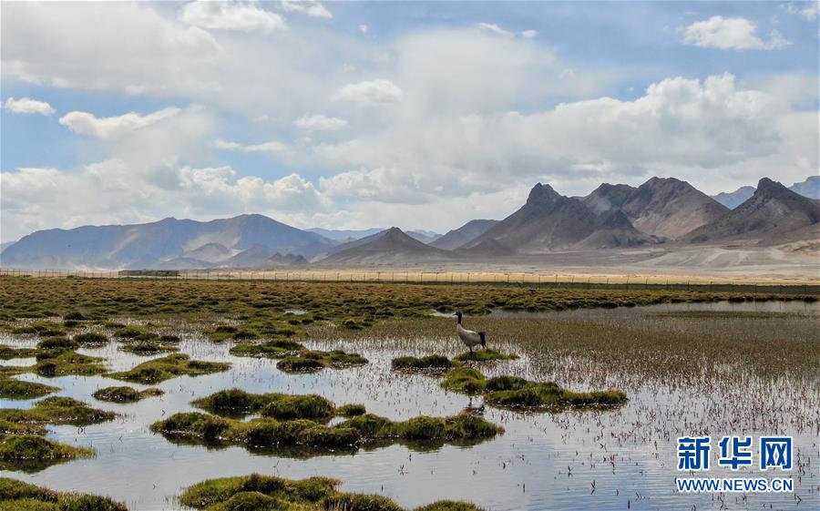 一只黑頸鶴在珠峰腳下濕地里覓食(5月17日攝)。