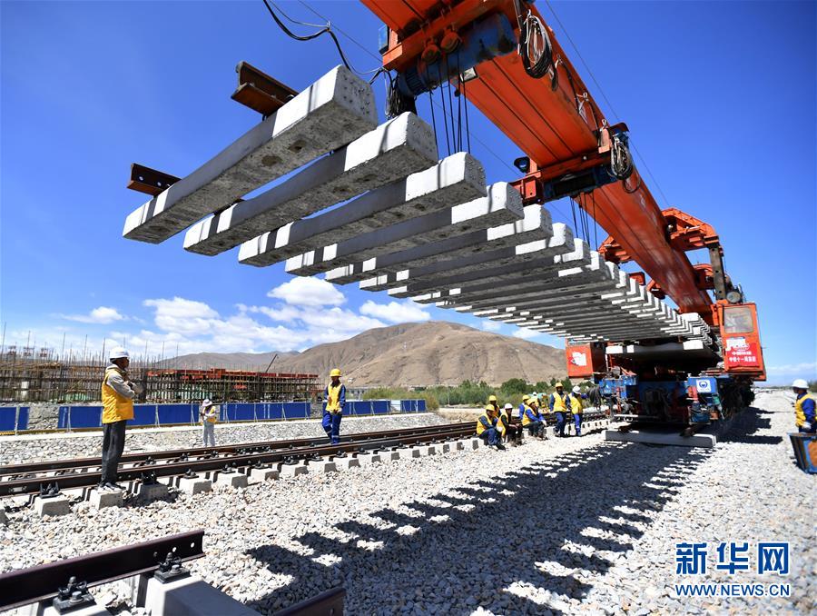 6月6日,負責鋪軌的中鐵十一局集團的建設者在現(xiàn)場作業(yè)。新華社記者覺果攝