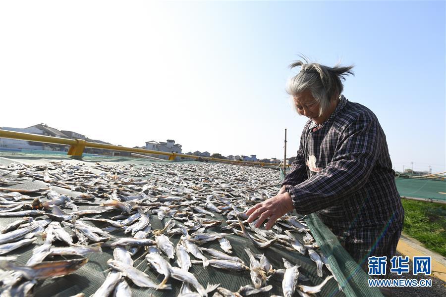 3月12日,浙江省湖州市吳興高新區(qū)幻溇村村民在曬魚干。近日,太湖南岸湖州地區(qū)久雨初晴,漁民忙著制作、晾曬魚干。新華社記者翁忻旸攝