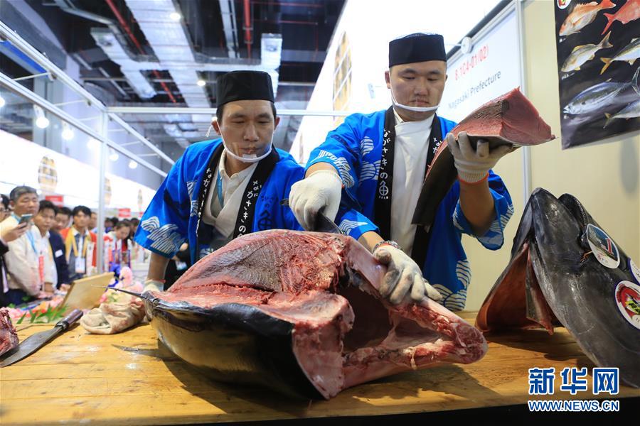 新11月7日,來自日本長崎魚市株式會社的專業(yè)切魚師傅在現場解體70公斤藍鰭金槍魚。第二屆中國國際進口博覽會正在上海國家會展中心舉行。博覽會的食品及農產品展區(qū)里匯集了來自世界各地的美食,同時也上演各種精彩美食秀。11月7日,來自日本長崎魚市株式會社的專業(yè)切魚師傅現場解體一條70公斤的藍鰭金槍魚,吸引大量參觀者觀看、品嘗。新華社記者隋先凱攝