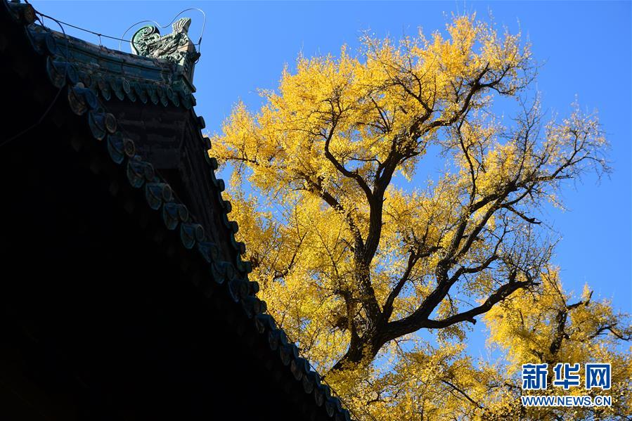 11月11日,大覺寺內(nèi)的古銀杏與建筑相映成趣。新華社記者尹棟遜攝
