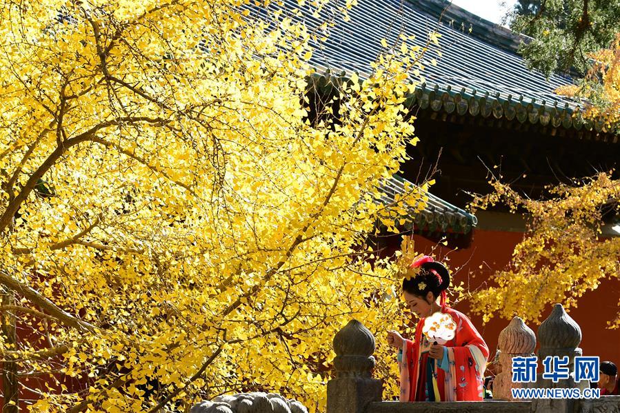 11月11日,一名漢服愛(ài)好者在大覺(jué)寺內(nèi)的古銀杏樹(shù)旁留影。新華社記者尹棟遜攝