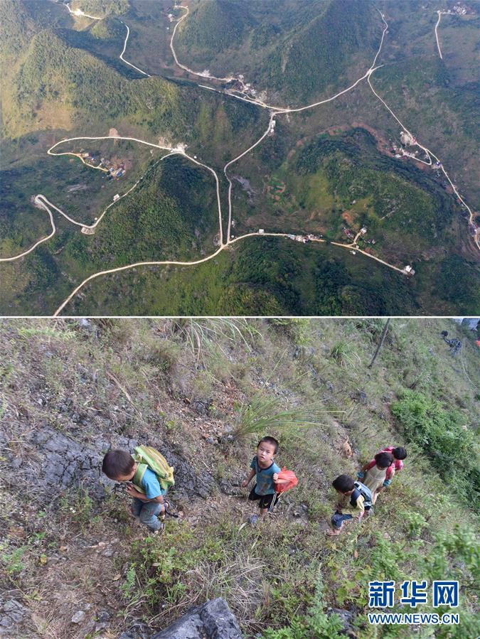 拼版照片:上圖為大化瑤族自治縣七百弄鄉(xiāng)弄良村弄丘屯剛剛修通的公路(右下段)和村道、鄉(xiāng)道連接(11月12日無人機拍攝);下圖為在尚未通路的弄良村弄丘屯,孩子們爬“天梯”回家(2016年12月9日攝)。新華社記者 黃孝邦 攝
