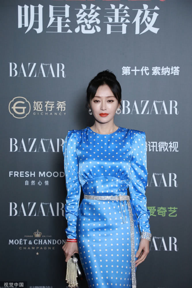 秦嵐穿波點(diǎn)藍(lán)裙身姿婀娜,靈動(dòng)飄逸似美人魚。