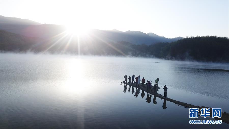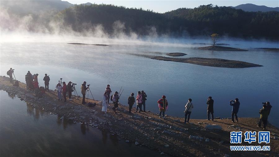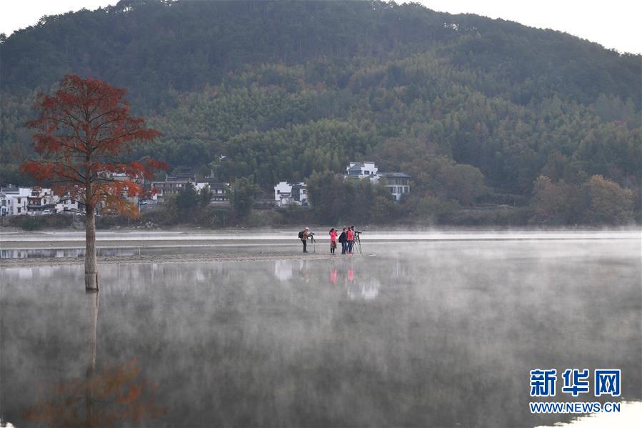 11月14日,游客在奇墅湖邊拍攝風(fēng)光。 初冬時(shí)節(jié),安徽省黃山市黟縣奇墅湖晨霧縹緲,別具韻味。新華社記者劉軍喜攝