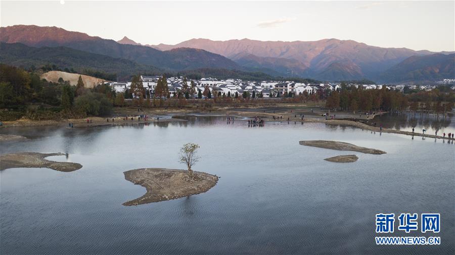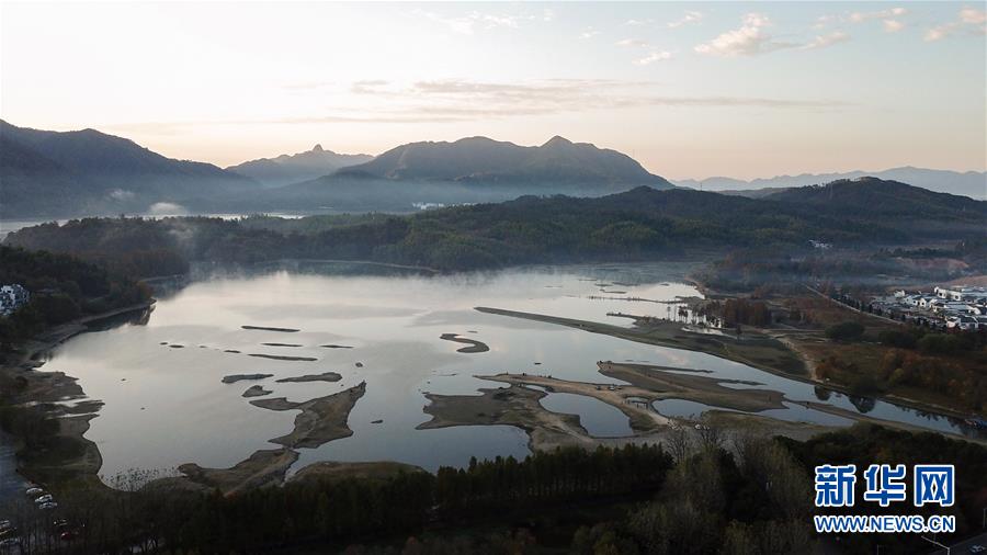 11月14日拍攝的安徽黟縣奇墅湖晨景(無(wú)人機(jī)航拍)。新華社記者張笑宇攝