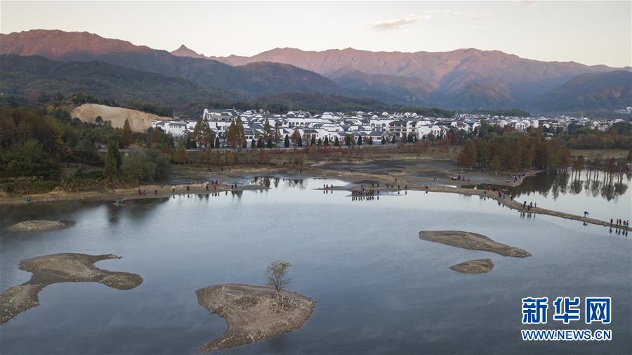 11月14日無(wú)人機(jī)拍攝的安徽黟縣奇墅湖晨景。新華社記者張端攝