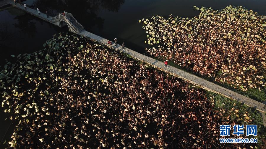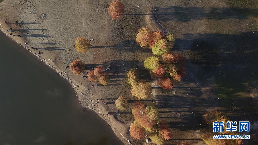 11月14日,游客在奇墅湖邊拍照(無(wú)人機(jī)拍攝)。新華社記者張端攝