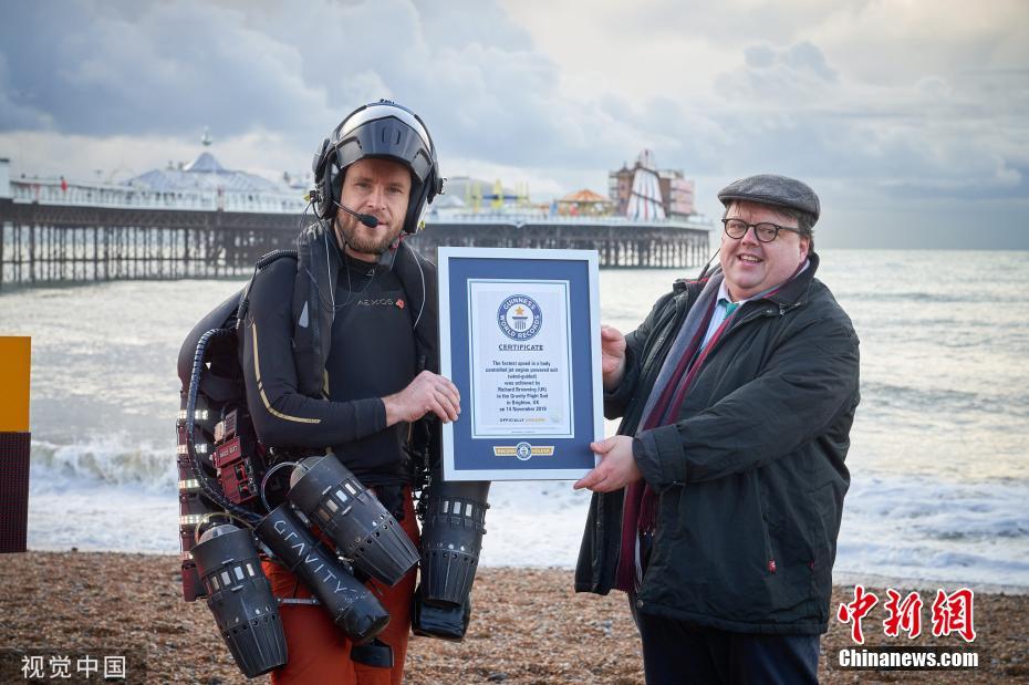11月18日訊,英國布萊頓,英國發(fā)明家理查德·布朗寧穿著一套由身體控制、噴氣發(fā)動機(jī)驅(qū)動、風(fēng)力導(dǎo)向的飛行服,以高達(dá)每小時85.06英里(約137公里)的飛行速度,打破了自己創(chuàng)下的噴氣式飛行服速度的吉尼斯世界紀(jì)錄。圖為工作人員為理查德·布朗寧頒獎。圖片來源:視覺中國