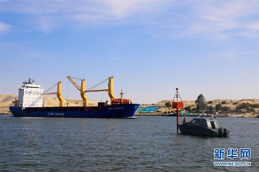 11月17日,在埃及伊斯梅利亞,一艘貨輪從蘇伊士運河上駛過。埃及蘇伊士運河管理局17日在埃及東北部伊斯梅利亞省舉行儀式,慶祝蘇伊士運河通航150周年。新華社記者李碧念攝