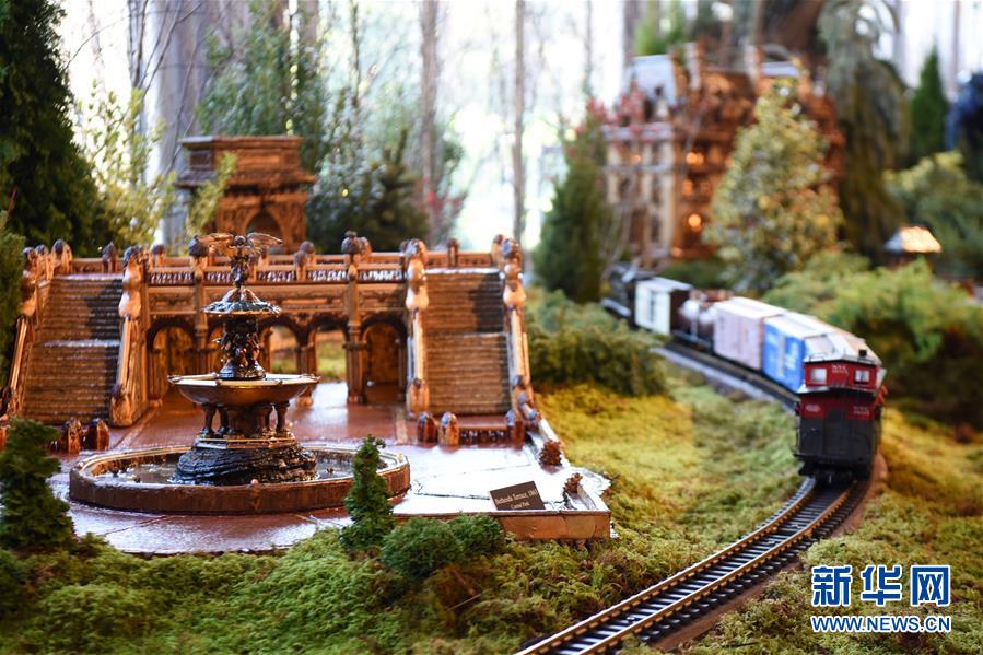 11月26日,在美國(guó)紐約植物園節(jié)日小火車展上,一輛模型小火車駛過紐約中央公園貝塞斯達(dá)噴泉和臺(tái)階微縮模型。新華社記者韓芳攝