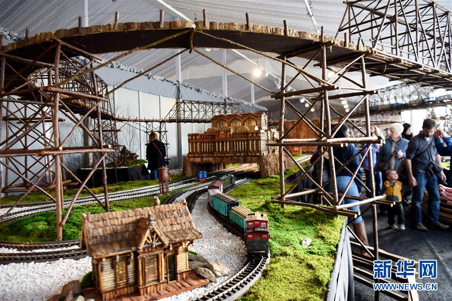11月26日,在美國(guó)紐約植物園節(jié)日小火車展上,模型小火車駛出紐約中央車站微縮模型。新華社記者韓芳攝