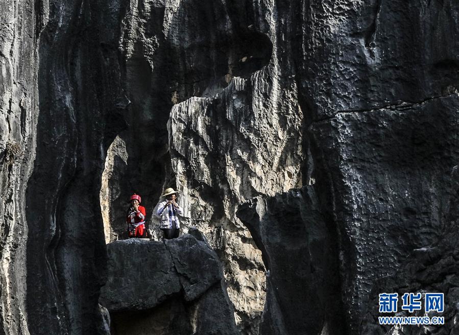 當?shù)厣贁?shù)民族樂手在石林景區(qū)演奏民族音樂(11月27日攝)。新華社記者蘭紅光攝