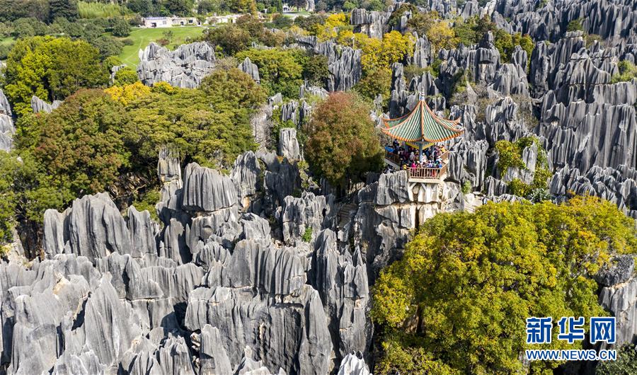 11月28日,游客在石林景區(qū)游覽(無人機拍攝)。新華社記者江文耀攝