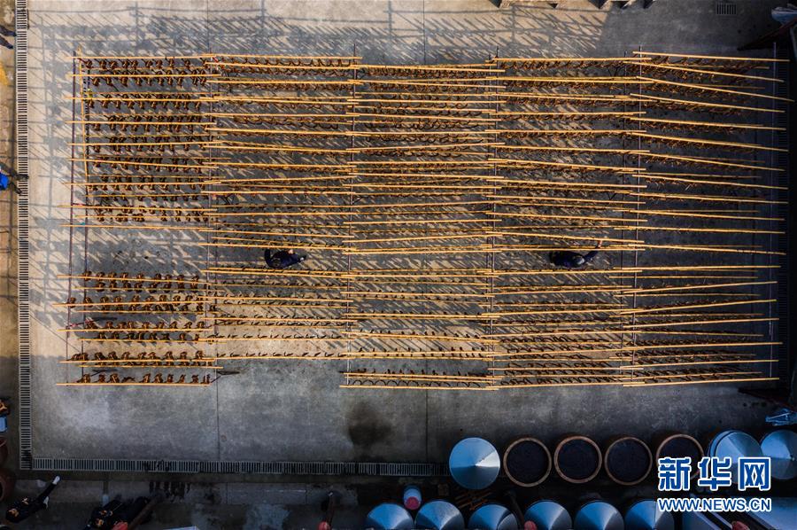 12月3日,安昌古鎮(zhèn)傳統(tǒng)臘味作坊里曬滿了各種手工制作的紹興臘味(無人機(jī)拍攝)。新華社記者徐昱攝