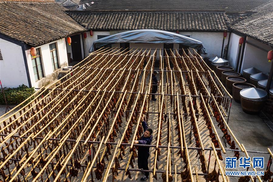 12月3日,安昌古鎮(zhèn)傳統(tǒng)臘味作坊里曬滿了各種手工制作的紹興臘味(無(wú)人機(jī)拍攝)。新華社記者徐昱攝