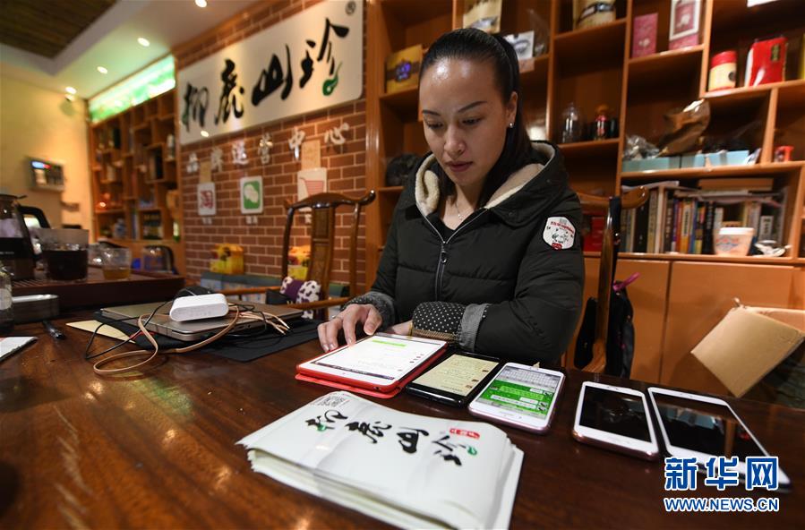 李柳萍在特產館里通過手機接收訂單(12月14日攝)。