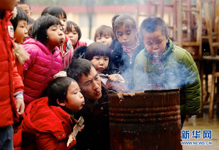 1月3日,在江西省鷹潭市余江區(qū)春濤鎮(zhèn)黃泥小學,老師章站亮(前右)和學生們一起生火。由于生火用的材料均是廢棄的桌椅或者枯葉,點火后得不停地靠嘴吹氣才能燒得旺盛。2018年9月,44歲的章站亮來到黃泥小學擔任校長,黃泥小學物質(zhì)條件艱苦,沒有食堂。他每月自費買菜為孩子們義務加餐,被孩子們稱為“廚神爸爸”。新華社記者胡晨歡攝