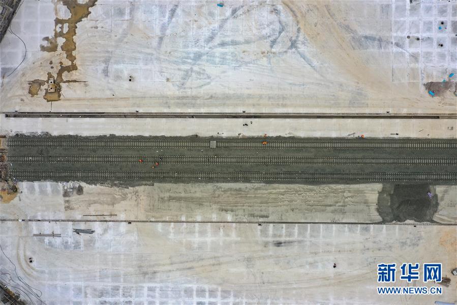 12月17日,中鐵八局建設者們在改貌鐵路口岸施工(無人機拍攝)。 新華社記者 劉續(xù) 攝