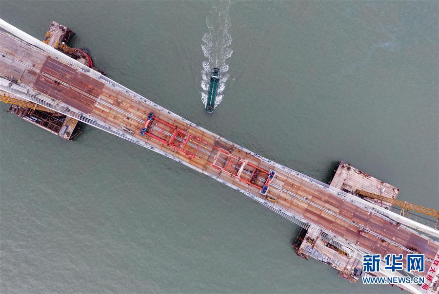 9月21日,平潭海峽公鐵大橋鼓嶼門航道橋的鋼桁梁在吊裝中(無人機拍攝)。新華社記者林善傳攝