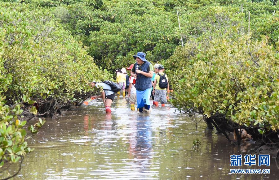 海南東寨港國(guó)家級(jí)自然保護(hù)區(qū)林業(yè)工程師馮爾輝(前)在保護(hù)區(qū)內(nèi)為學(xué)生進(jìn)行講解(7月16日攝)。 馮爾輝2009年大學(xué)畢業(yè)后來到保護(hù)區(qū)工作,小時(shí)候他家就住在紅樹林邊上,他從小和紅樹林打交道,喜歡動(dòng)植物和鳥類。外貿(mào)專業(yè)畢業(yè)的他邊工作邊學(xué)習(xí),目前主要從事鳥類監(jiān)測(cè)、紅樹林保育、自然教育等工作。“紅樹林看著我長(zhǎng)大”,馮爾輝說,濕地保護(hù)的工作非常有意義。 新華社發(fā)