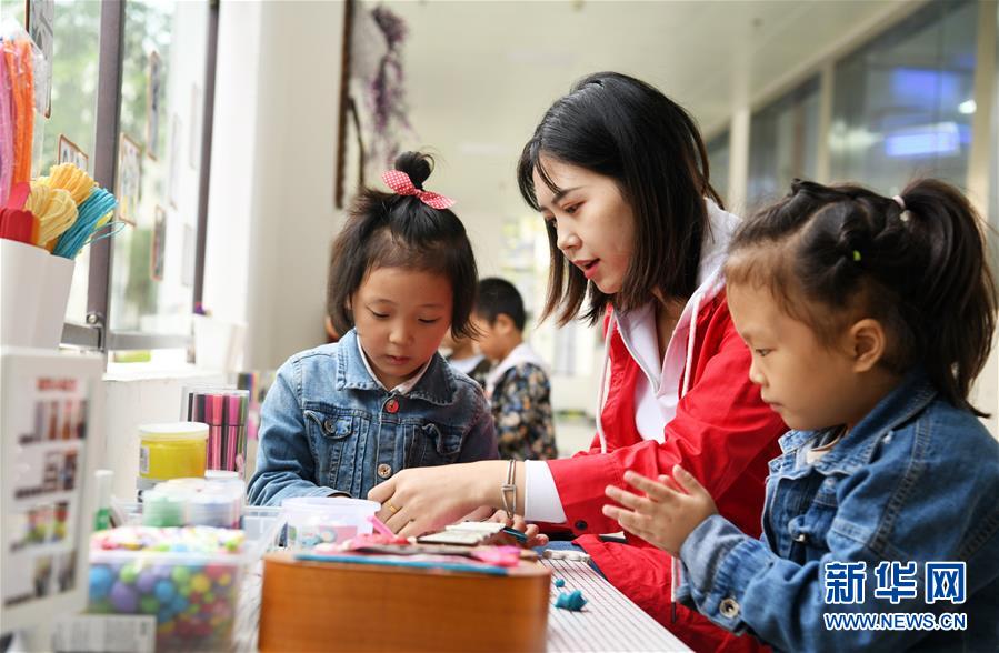 在貴州省正安縣瑞濠街道易地扶貧搬遷安置點的一所幼兒園,老師指導(dǎo)小朋友做手工(10月11日攝)。新華社記者 楊文斌 攝