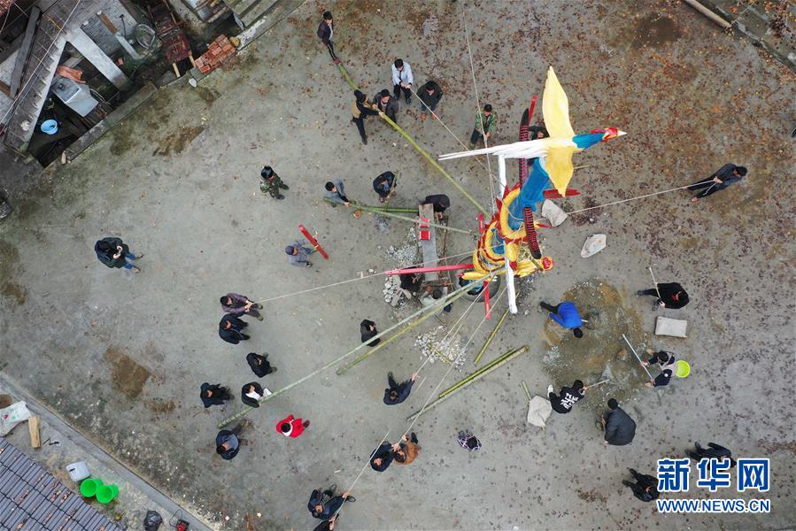 烏英苗寨的村民在立新蘆笙柱(12月22日無(wú)人機(jī)拍攝)。